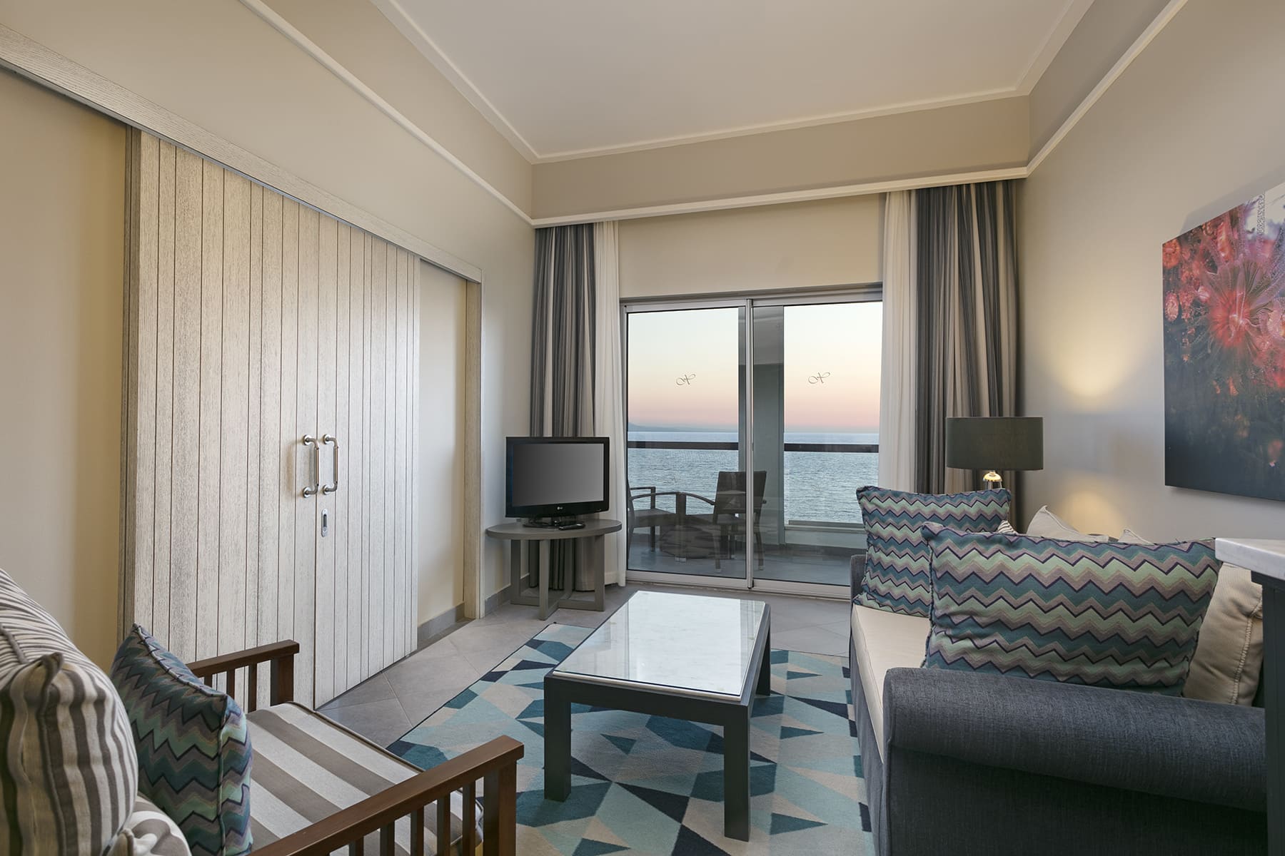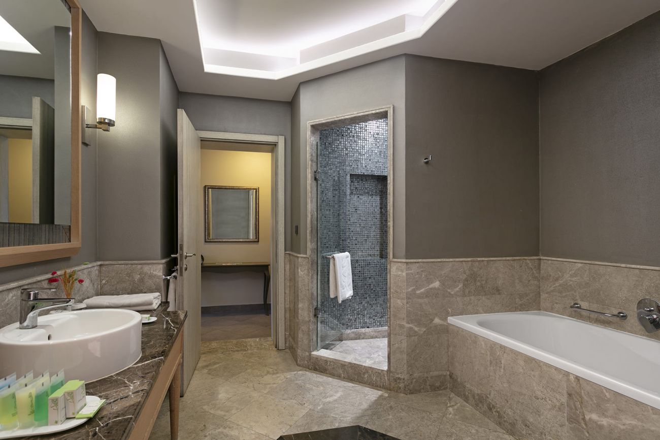 Стаи: Courtyard suite (1 спалня, зона за сядане, 1 баня - 51 М²), Sunset suite room (1 спялня, 1 хол, 1 баня, изглед море - 70 М²), Manor house suite room (1 спялня, 1 хол, 1 баня, изглед море - 72 М²), Romance suite room (1 спалня, зона за сядане, 1 баня - 60 М²), King suite (1 спялня, 1 хол, 1 баня, изглед море - 85 М²), Elegance suite (2 спялни, 1 хол, 1 баня, изглед море - 92 М²), Lavender suite (2 спялни, гардеробна, 1 баня, изглед море - 110 М²), Suite Room (2 спялни, 1 хол, 1 баня, изглед море - 124 М²), Royal suite room (3 спялни, 1 хол с трапезария, 2 бани- 238 М²)