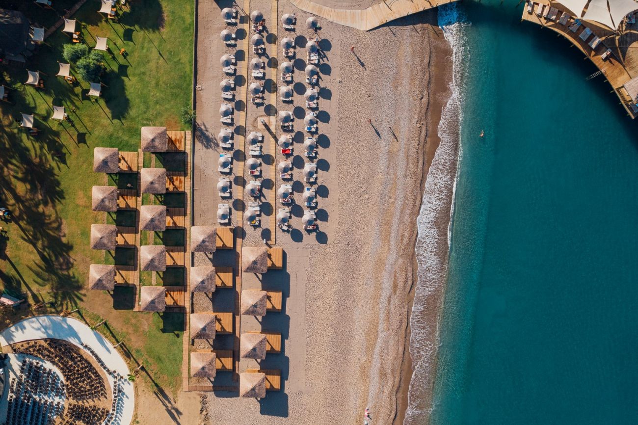 Собствен, пясъчно - чакълест. Чадъри, шезлонги и плажни кърпи на плажа и при басейна – безплатно.