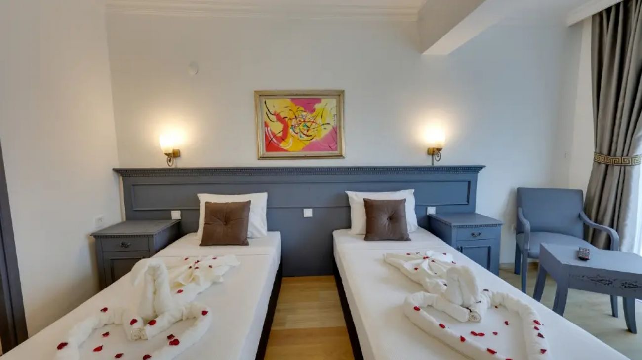 Хотелът разполага с общо 74 стаи - 58 Standard Room (25m2), 16 Superior Room (35m2). Всички оборудвани с климатик, телевизор, телефон, баня с душ, мини бар (празен), френски балкон или тераса. Почистване на стаите - всеки ден, смяна на спалното бельо и кърпите - на 3 пъти в седмицата.