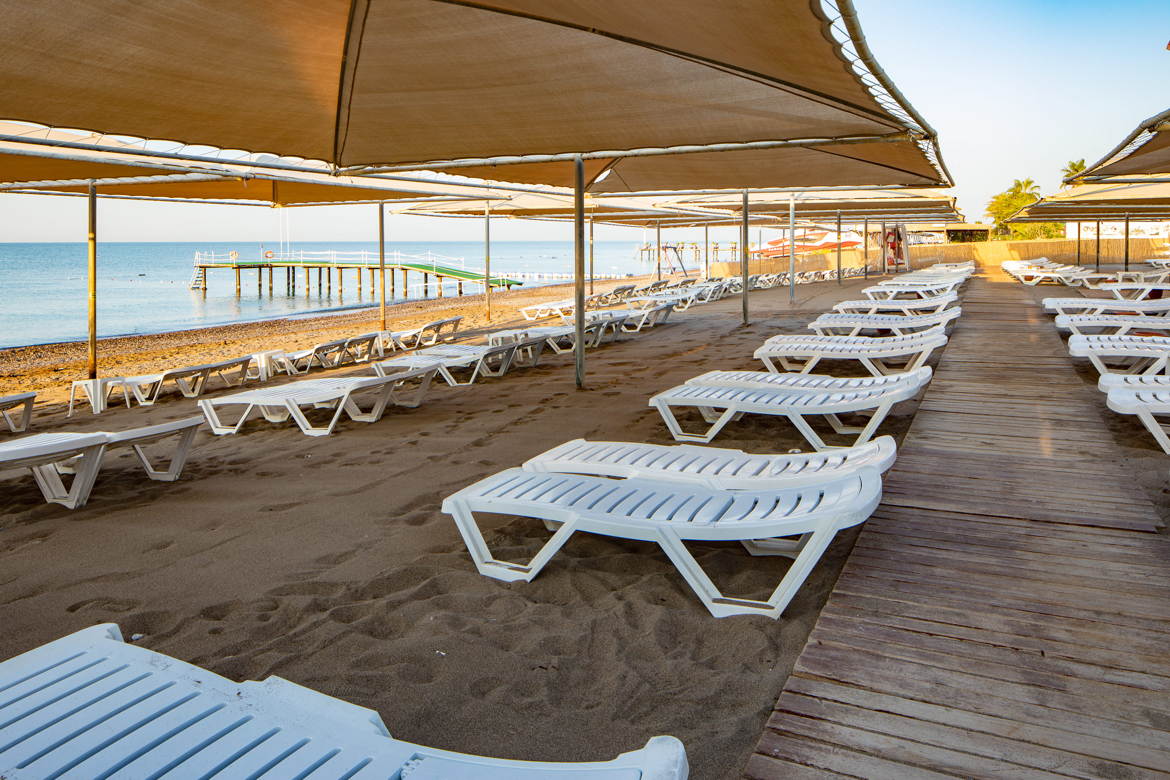 Собствен пясъчно-чакълест плаж. Чадъри, шезлонги, матраци н а плажа и при басейна– безплатно.