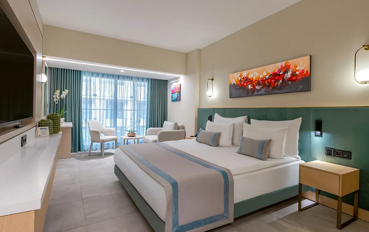 Стаи Main Building - Atrium room (изглед градина - 33 м2); Deluxe room (изглед градина, планина или море – 36 м2), Deluxe Superior room (спалня, единично и допълнитлено легло, изглед градина, планина или море,– 38 м2), Deluxe Superior Family (две помещения, спалня и две единични легла, две бани, 2 балкона, изглед градина или планина – 71 м2), Deluxe room (изглед градина или планина – 36 м2), Deluxe Family (две помещения, спалня и двуетажно легло, две бани, изглед градина – 58 м2).