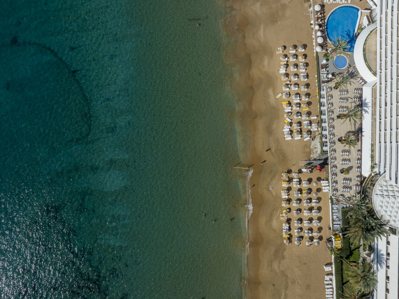 Собствен, пясъчен. Чадъри, шезлонги, матраци и плажни кърпи на плажа и при басейна - безплатно.