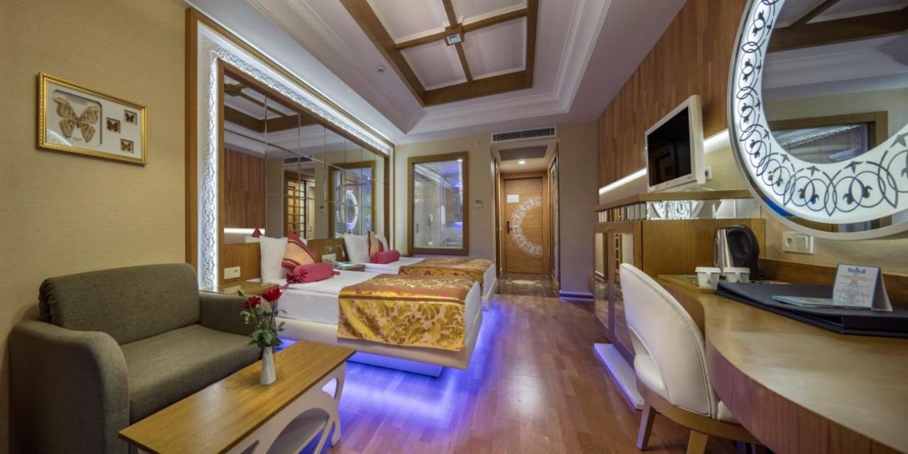 Хотелът разполага с общо 598 стаи, разположени в една 10-етажна основна сграда, от които 537 Standard room (с изглед суша или море - 26-36 m²), 29 Doublex family land view (на 2 нива, всяко от които има 1 спалня и 1 баня, 65–75 м2); 12 Family room sea view (2 спални – 50 м2). Всички стаи са оборудвани с климатик, телевизор, телефон, баня с душ, сешоар, сет за кафе/чай, минибар (вода, безалкохолни напитки, бира – безплатен), сейф (безплатен). Почистване на стаите и смяна на кърпите - всеки ден, смяна на спалното бельо - 2 пъти в седмицата.