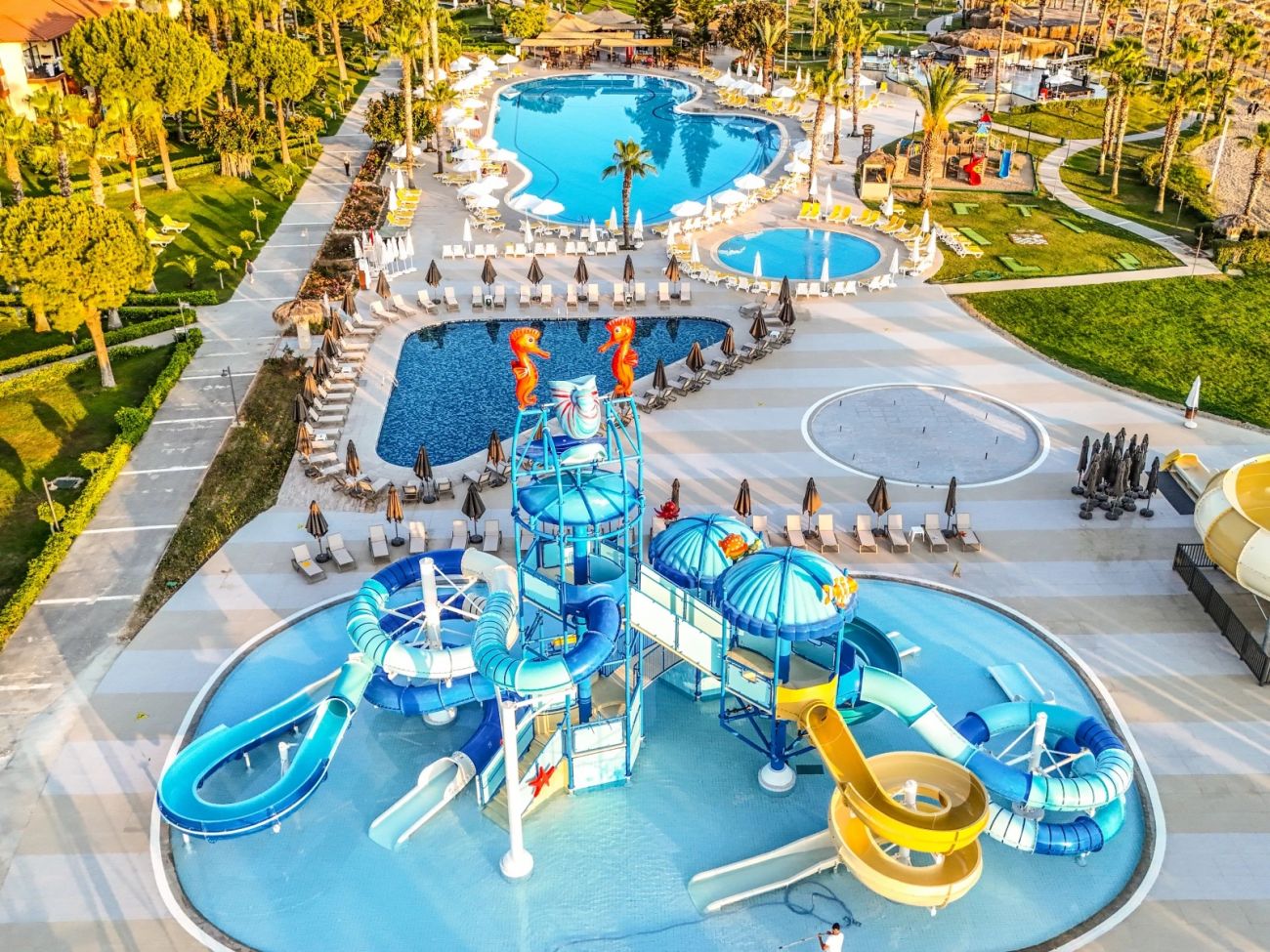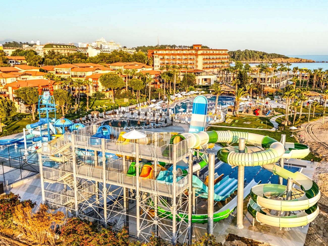 Основен ресторант, 3 а-ла-карт ресторанта (турски, италиански, средиземноморски - с предварителна резервация, съгласно концепцията на хотела), 5 бара, 3 открити и 1 закрит басейн, водни пързалки, амфитеатър, дискотека, СПА център, магазини, 3 конферентни зали, паркинг.