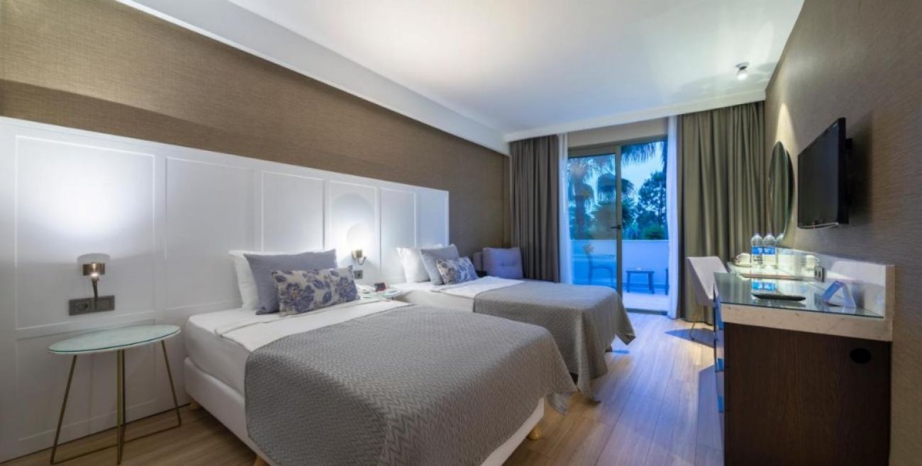 Комфортните стаи на хотела са оборудвани с балкон, климатик, телевизор, сейф, минибар и самостоятелна баня със сешоар. Предлага ресторанти, барове, плаж, басейн, водни пързалки, джакузи, сауна, турска баня, фитнес център и детски клуб. Гостите на хотела могат да се отпуснат напълно в приятелска атмосфера и да намерят забавление по свой вкус.