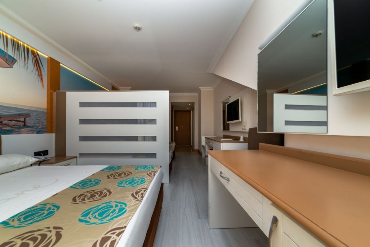 В стаите: Хотелът разполага с общо 351 стандартни стаи, 172 фамилни стаи и 12 апартамента. Всички стаи са оборудвани с климатик, телевизор, телефон, баня с душ, сешоар, минибар ( минерална вода - безплатно ), сейф (срещу заплащане), балкон. Почистване на стаите - всеки ден, смяна на спално бельо - 3 пъти седмично, смяна на кърпи - всеки ден.