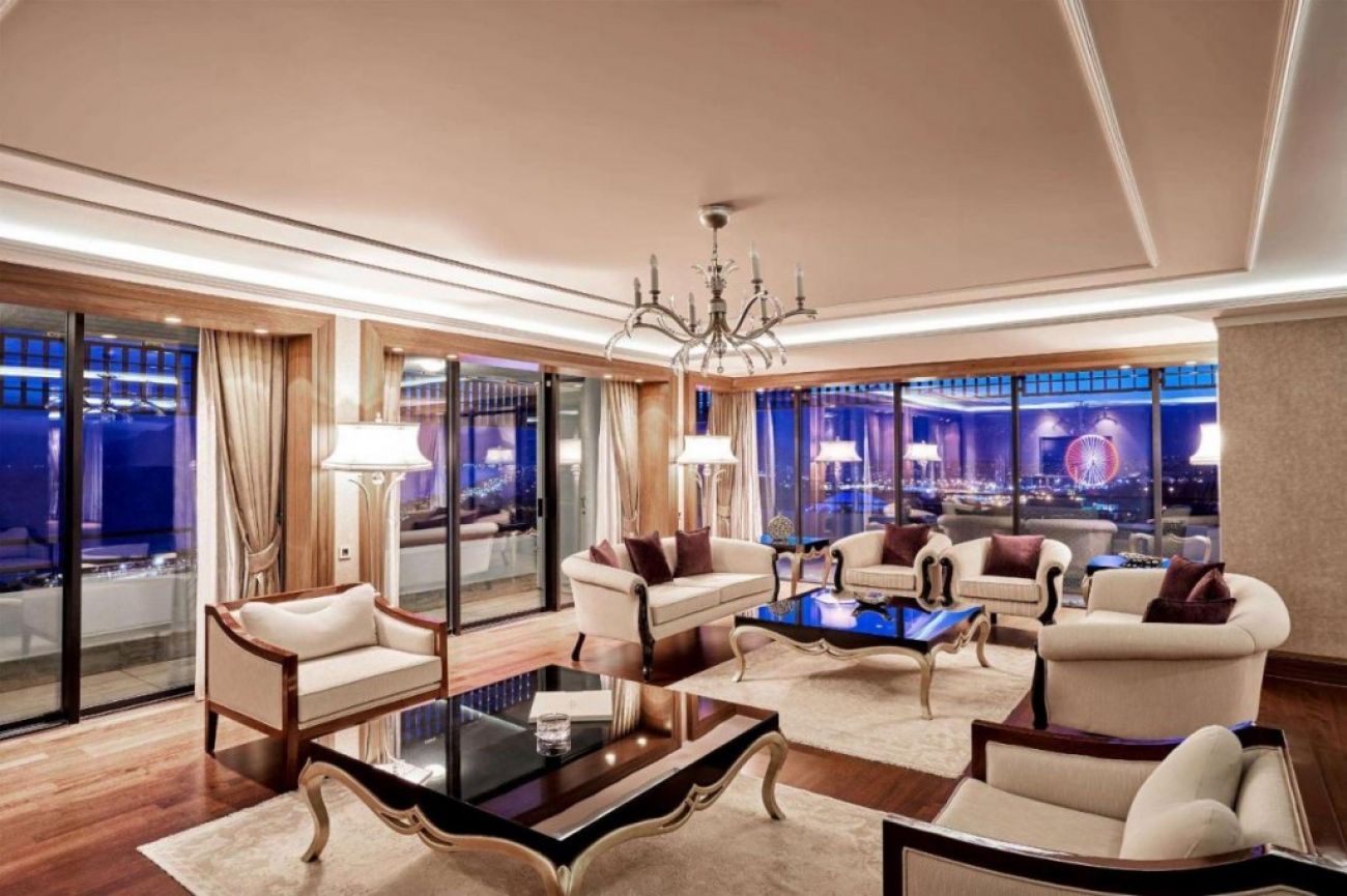 Роял суит с 1 хол и 2 спални с площ 128 м2 предлага няколко жилищни помещения. Апартамента се отличава с най-високи нива на лукс и 2 бани. Свързване към Интернет и 3 LCD телевизора, гарантират комфортен престой в хотел Rixos.