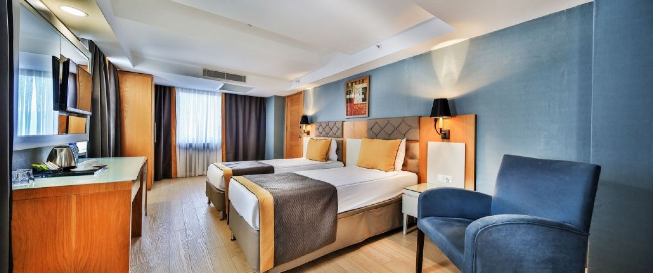 Всяка стая (Standard Land View, Standard Sea View, Family Room, Dublex Family Room, Jacuzzi Room, Terrace Jacuzzi Room) в хотела разполага с балкон. Всяка стая разполага с климатик, сейф и телевизор, а някои помещения в Saturn Palace Resort имат тераса. Удобствата включват и минибар.