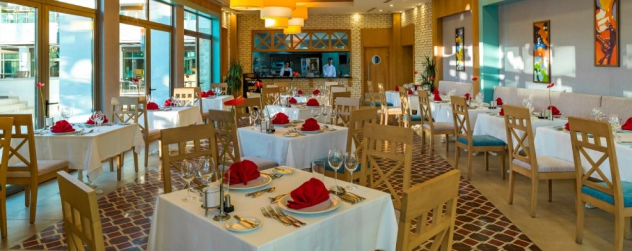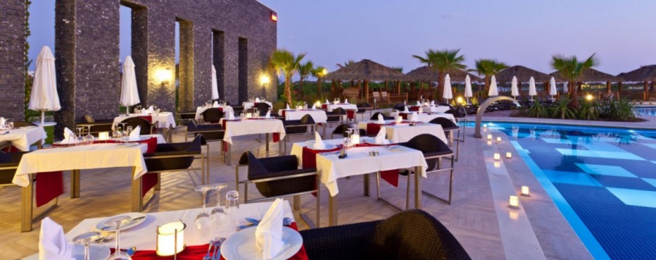 На териториата: 2 Основни ресторанта(бюфет и a-la carte). 4 барове. Басейни.Обедно барбекю до басейна. Детски басейн.Фитнес и спортни програми. водни спортове. мастеркласове.Различни анимационни програми за възрастни(вечерни шоуве, жива музика,дискотеки).Тенис на маса и билярд. Спа и уелнес център. Турска парна баня.