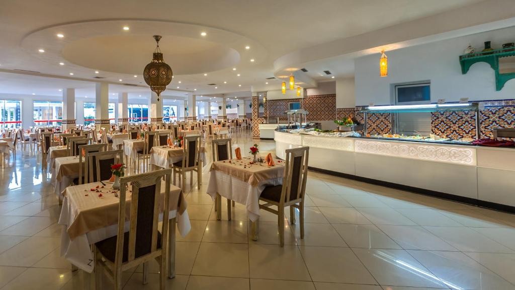 На територията на хотела: Основен ресторант, лоби бар, снак бар на басейна, мавританско кафене, открит басейн, закрит отопляем басейн (отопляем през зимата), аква парк (2 басейна, 10 водни пързалки: 5 пързалки за възрастни, 5 пързалки за юноши, басейн с мини пързалки за малки деца), СПА център, конферентна зала, магазини, обмяна на валута.