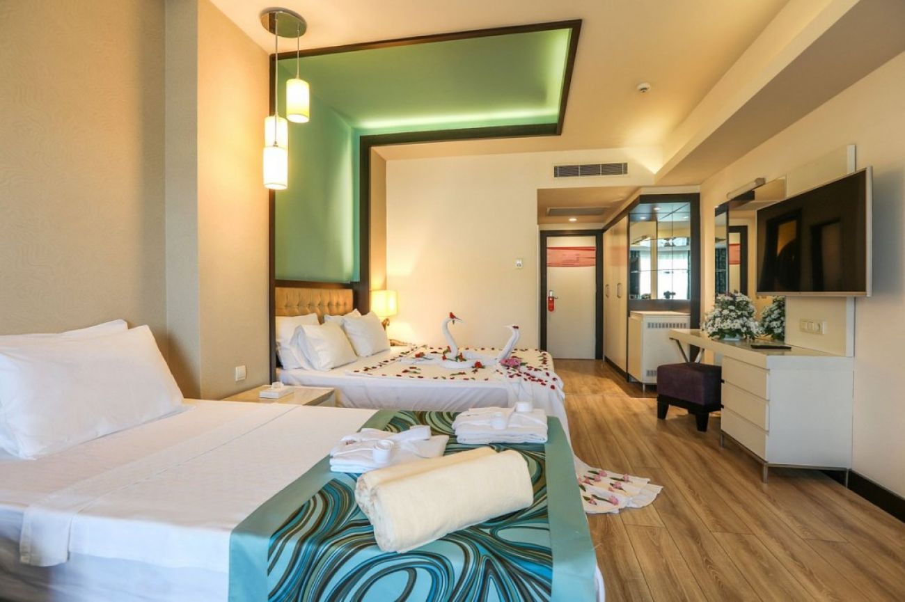 286 Standard Land view room (с изглед суша, 20-25 м2), 258 Standard Sea view room (с изглед море, 20-25 м2), 21 Standard Large room (с изглед суша, 30 м2), 34 Family room (2 спални, 1 баня, 55-60 м2), 1 King suite room (2 спални, 2 бани, джакузи - 90 м2), 1 Diamond room (1 голяма спалня, 2 дивана и маса, 1 баня - 60 м2),