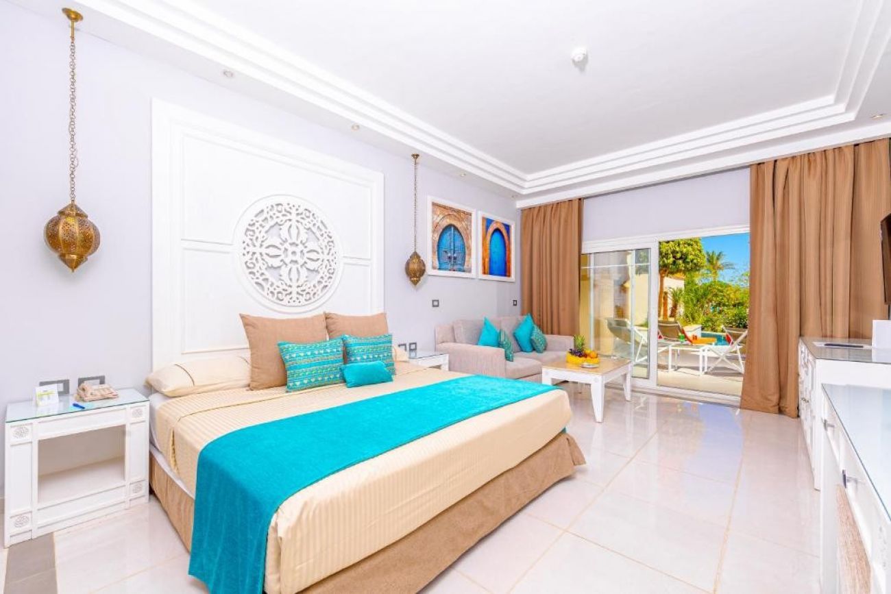 Junior Suites with Pool Access: за 2-ма възрастни разполагат с всекидневна зона за сядане и тераса с директен достъп до общия плувен басейн. Размер: прибл. 48 м2