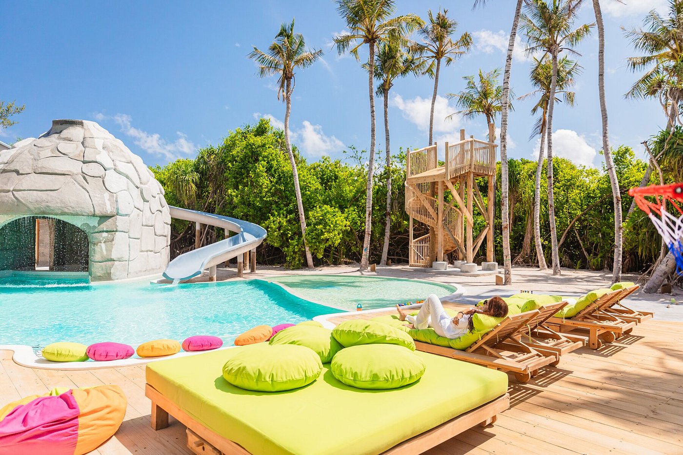 - 20 One Bedroom Water Reserve with Slide (55 кв.м.) - двестепенни водни вили с плъзгащ се покрив в южната част на острова. На първия етаж - спалня с двойно легло, детска спалня, хол, съблекалня, баня с баня, открит душ, тераса с басейн с прясна вода, шезлонг, люлки, хамак по вода. На втория етаж - тераса с трапезарна тава с водна пързалка. Максимално настаняване е 3 възрастни или 2 възрастни и 2 деца.
