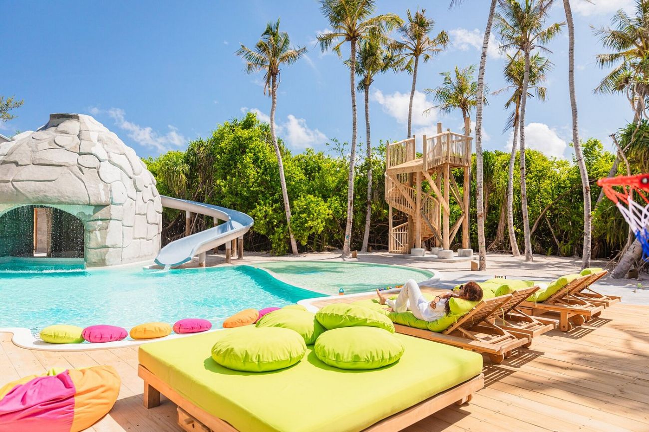 - 4 Two Bedroom Water Retreat with Slide (520 кв.м.) - две равнини водни вили с плъзгащ се покрив в северната част на острова. На приземния етаж има двойно легло, детска спалня, съблекалня, съблекалня, баня с вана, открит душ, кът за сядане, тераса с басейн със солена вода и хамаци на вода, шезлонги и спускане в океана. На втория етаж има спалня с двойно легло, съблекалня, баня с душ, павилион за хранене и тераса с водна пързалка. Максималното настаняване е 5 възрастни или 4 възрастни и 2 деца.