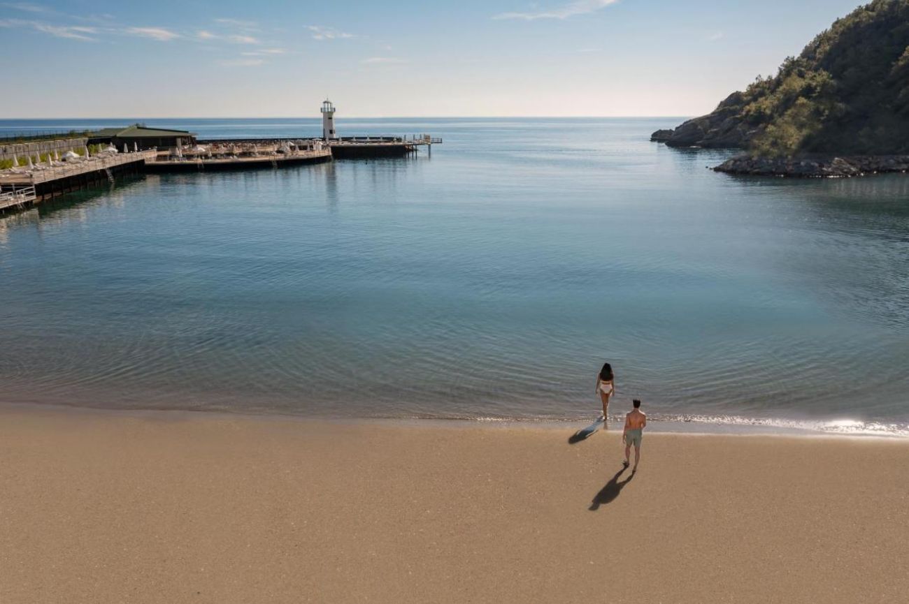 Собствен, пясъчен. Чадъри, шезлонги и матраци на плажа и при басейна – безплатно, плажни кърпи – безплатно.
