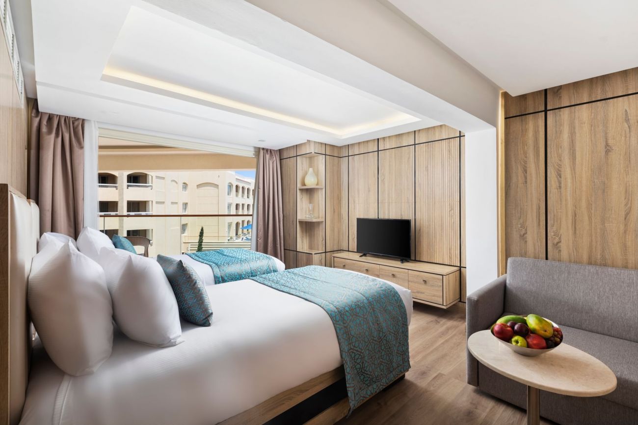 Хотелът разполага с общо 678 стаи, разположени в комплекс от двуетажни вили, основна четириетажна сграда и триетажен корпус. от които 374 Standart rooms (с изглед към градина, басейн или морето – 24 м2), 220 Standard bungalow rooms (с изглед към градина или море – 28 м2), 62 Family rooms (с изглед към градина, басейн или морето) и 22 Suites (с изглед към морето). Всички стаи са оборудвани с климатик, телевизор, телефон, баня с душ, сешоар, минибар (зарежда се всеки ден с минерална вода - безплатно), сет за чай/кафе, сейф, Wi-fi, балкон. Почистване на стаите и смяна на кърпите - всеки ден, смяна на спално бельо – 3 пъти в седмицата.