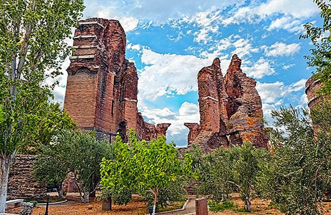 Червена базилика - Тази масивна руина е била построена от Адриан (117-138 г.) като храм, посветен на боговете Серапис и Изида. По-късно, през византийската епоха, тя е превърната в църква и посветена на апостол Йоан, който по-рано наричал този грандиозен езически храм трона на дявола. Въпреки че интериорът е силно разрушен, сградата определено е достойна за посещение, за да стане свидетел на огромната част от останалите стени, които дават чудесна представа за това как впечатляващият храм трябва да е изглеждал. Интериорът беше разделен на три колони по два реда колони. Централната пътека завършваше в полукръгла апсида с крипта отдолу.